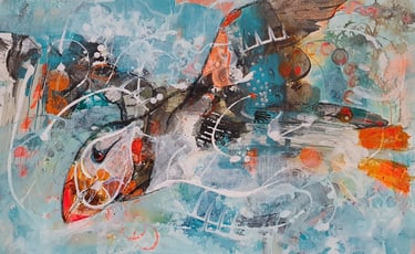 These “Out of Chaos Creatures” convey my love of the natural world. Working in this way keeps me joyfully engaged in a creative experience of the art. Each piece is painted intuitively so I do not know what will they will be in the early stages. Once I see something in the random marks made in the first few layers, I then start to bring out the form and details of whichever creature has appeared.